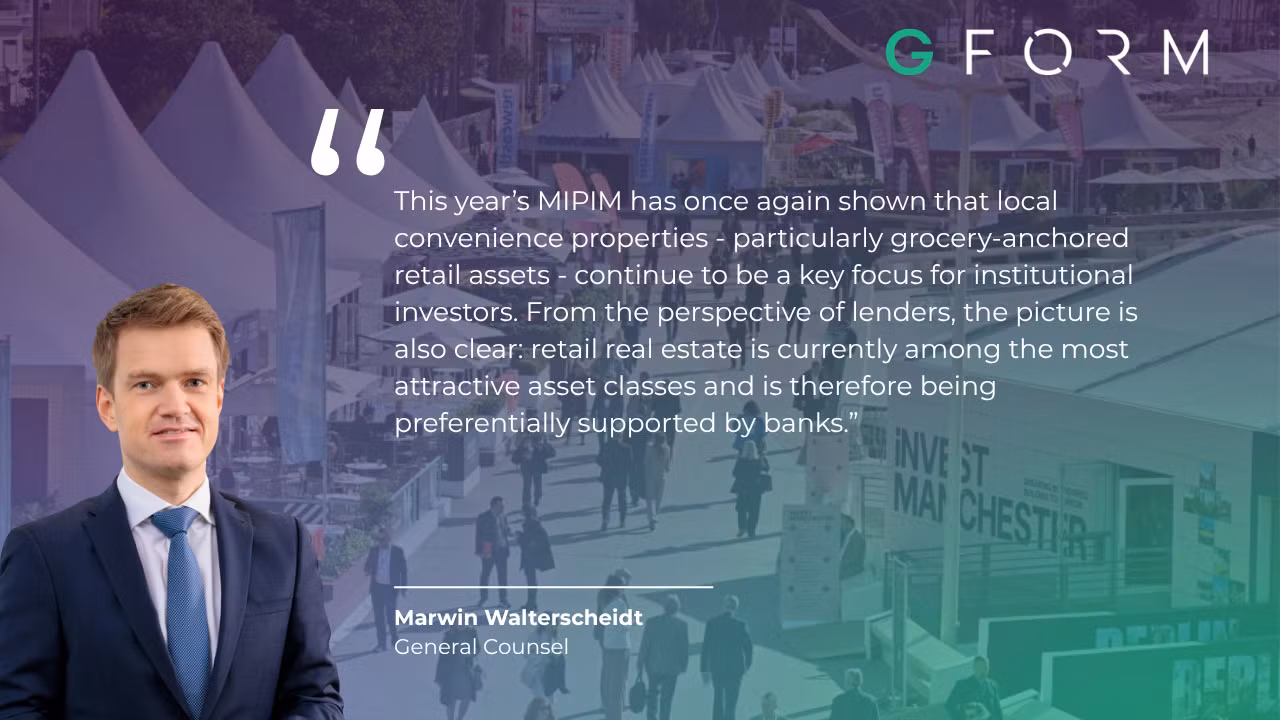 GFORM ist ein marktführender Spezialist im Bereich Mieter- und Gewerbeimmobilienmanagement mit Sitz in Berlin. Unser verwaltetes Portfolio umfasst einige der führenden Einzelhandelszentren Deutschlands, mit einem starken Schwerpunkt auf lebensmittelgeankerte Immobilien und Nahversorgung. Wir verfügen über umfassende Expertise in der Verwaltung von Assetklassen wie Mixed-use, Hybrid, Fachmarktzentren, Standalone-Supermärkten und Wohnimmobilien. Zu den von uns betreuten Fonds gehört Europas größter Artikel 9- Fonds gemäß der SFDR, was uns als Experten darin auszeichnet, Immobilien nachhaltig und zukunftssicher zu betreuen und Eigentümer sowie Mieter beim Erreichen ihrer ESG-Ziele zu unterstützen.